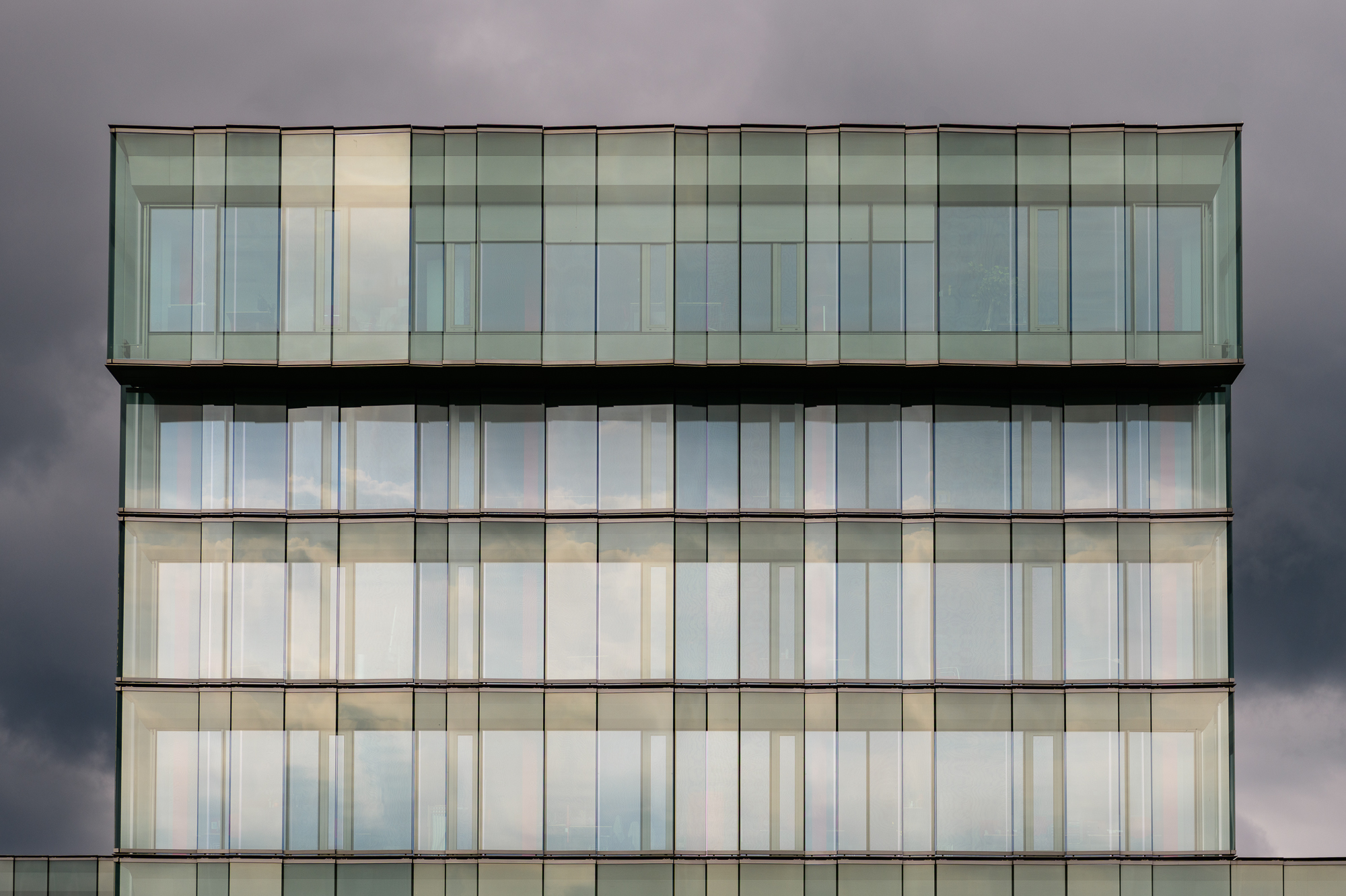Tall, symmetrical glass building reflecting soft light against a backdrop of dark clouds.