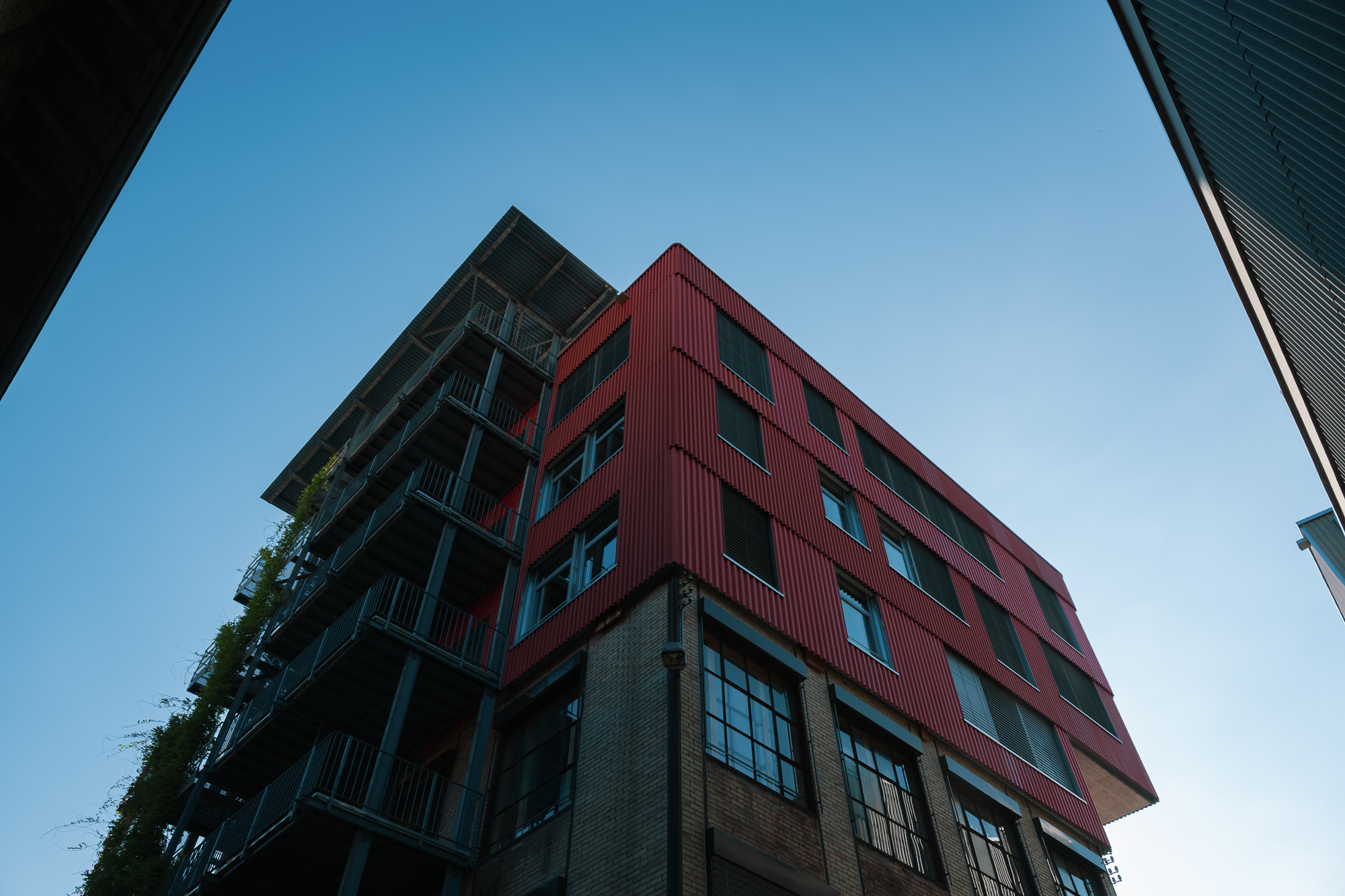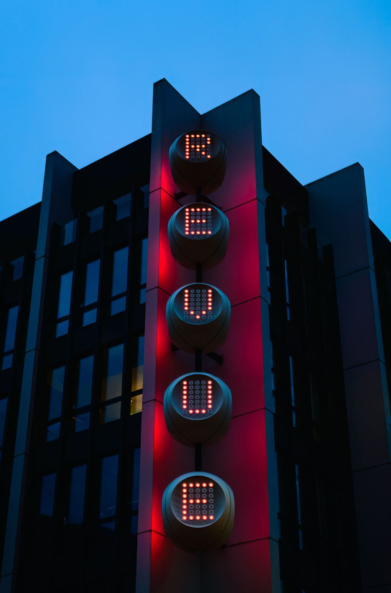A tall modern building features a vertical row of glowing red circular lights against a blue evening sky, creating a futuristic architectural look.