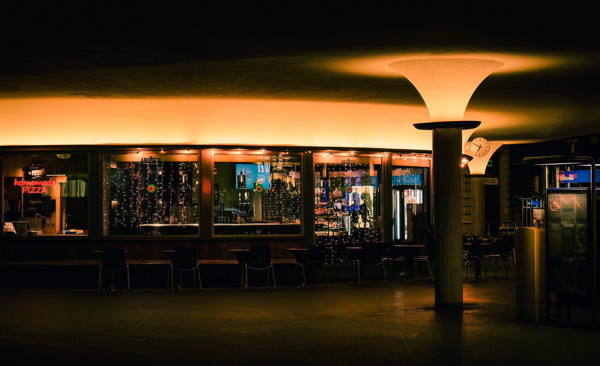 Before sunrise in Zurich, the station glows like a warm refuge against the cold. The café lights shimmer through the windows, the ceiling casts its soft halos, and the city feels suspended in that quiet moment just before the day wakes up.