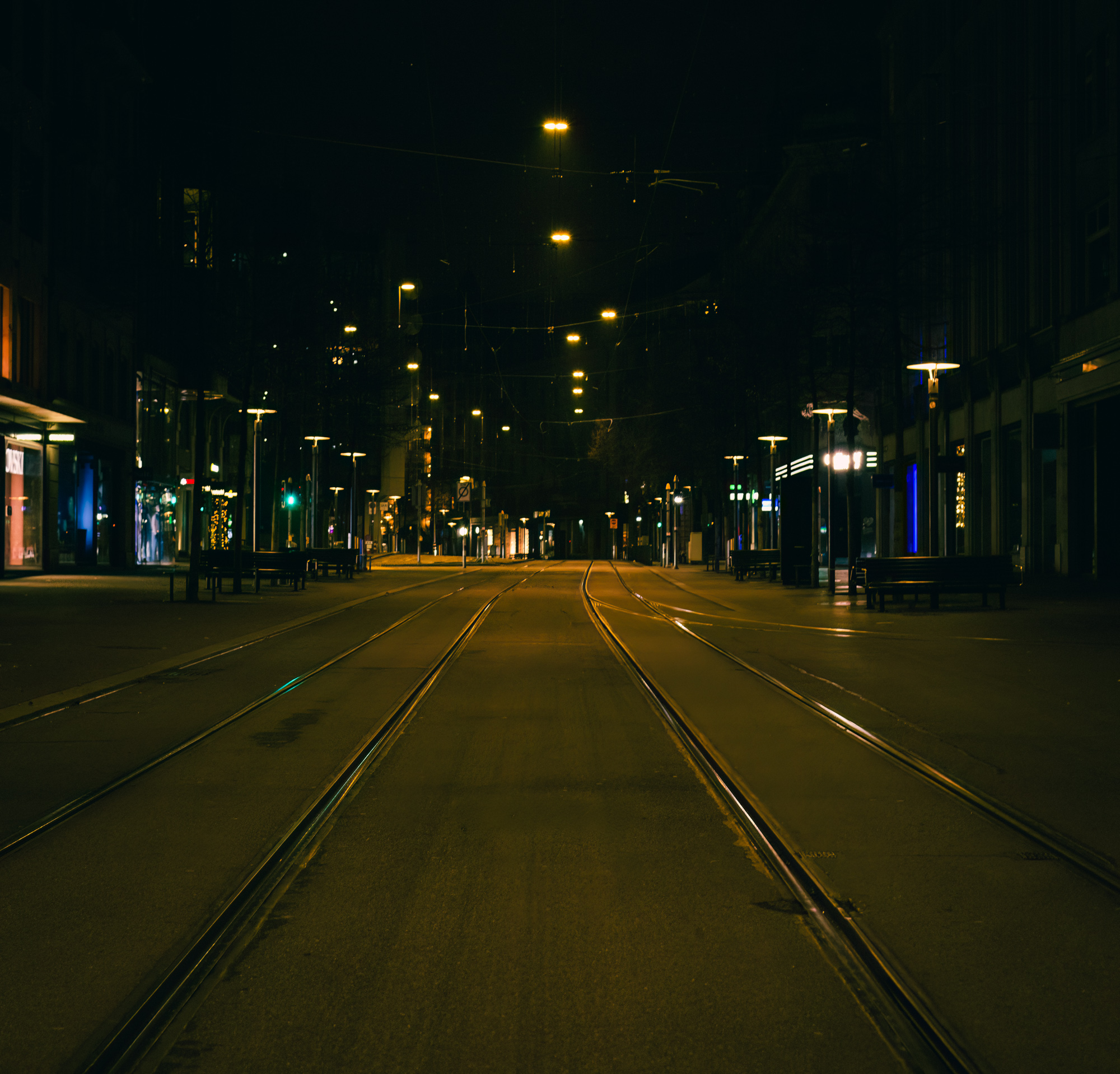 A quiet pre-dawn street in Zürich, with empty tram tracks leading into the distance under yellow streetlights and dark surrounding buildings, creating a cinematic and peaceful urban atmosphere.