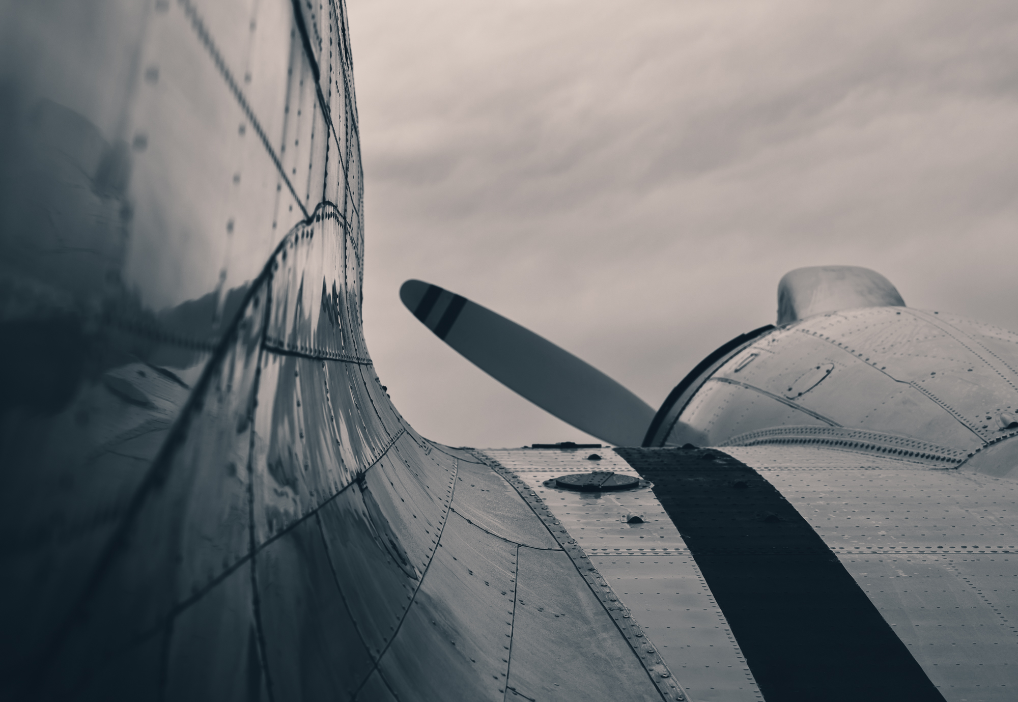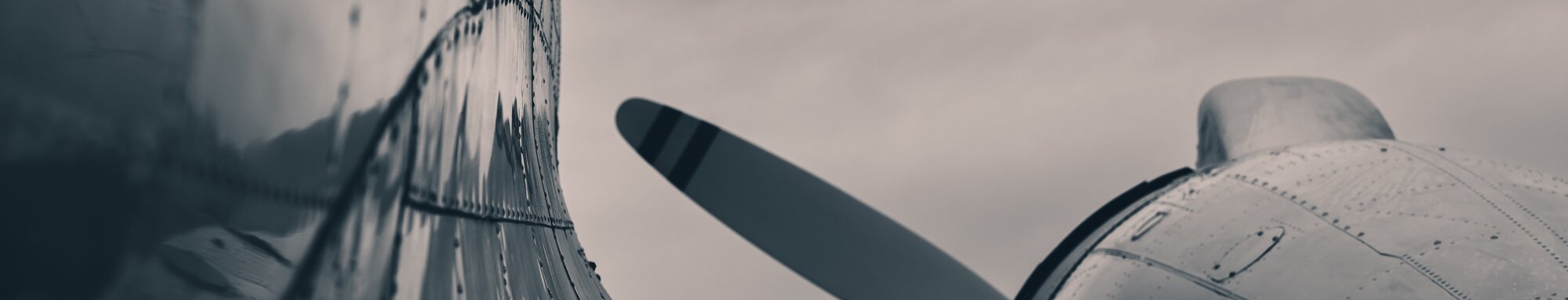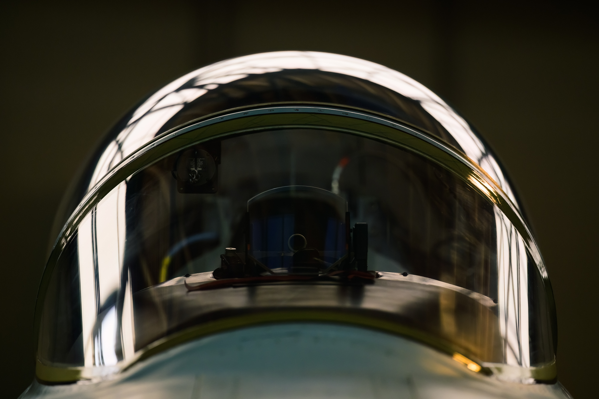 Hangar SentinelDimly lit side view of a vintage fighter jet’s nose and cockpit inside a hangar. Cockpit DomeFront-facing close-up of a fighter jet canopy with hangar lights reflecting on the curved glass. Winged GeometryA rear view of a commercial jet reveals clean metallic lines under a moody sky. Riveted GraceA close-up shows the curved body and rivets of a vintage propeller plane. Vintage PowerA vintage steam locomotive pushes forward through thick clouds of white steam. Iron ThrottleMetal valve wheel mounted on the side of a steam-locomotive boiler.