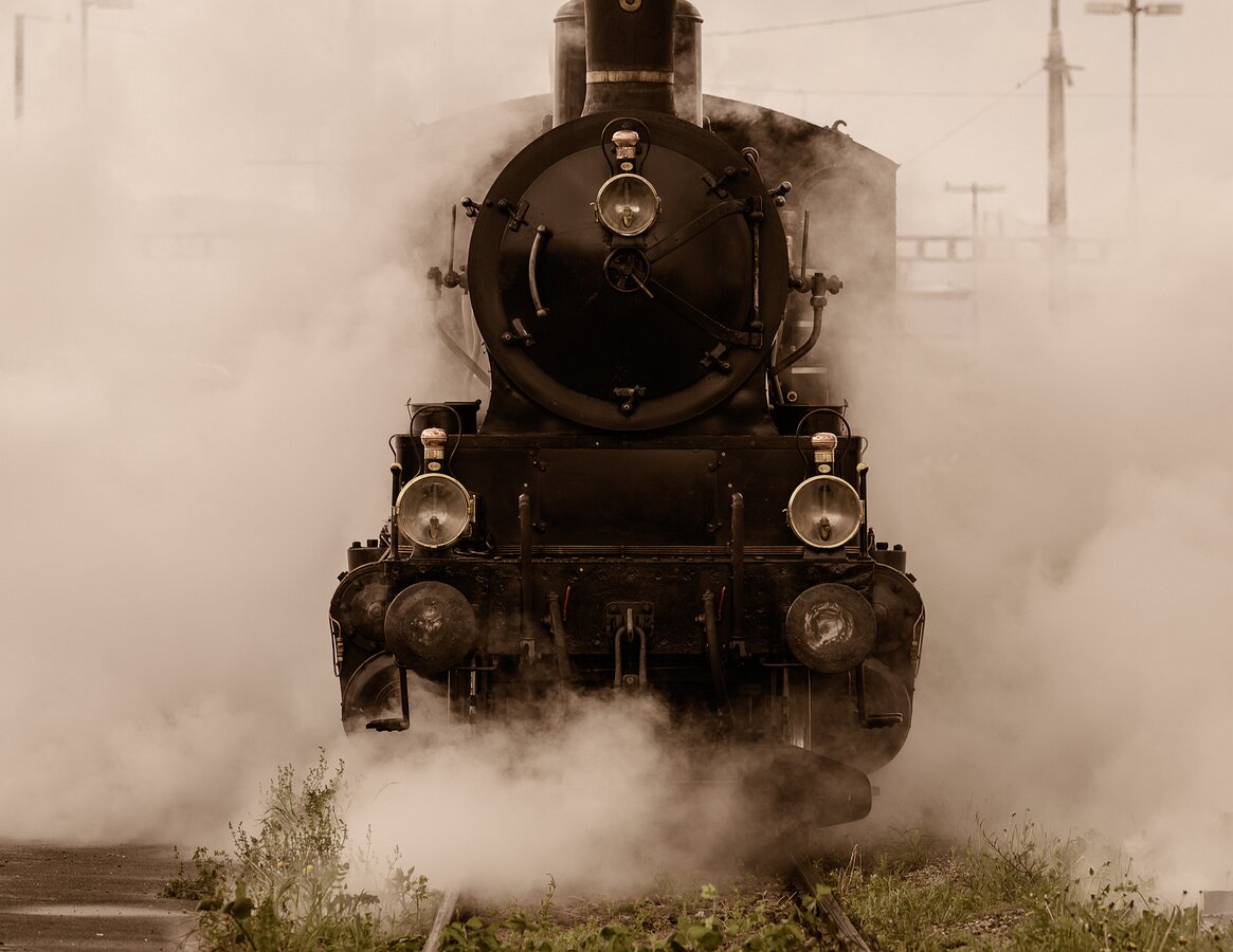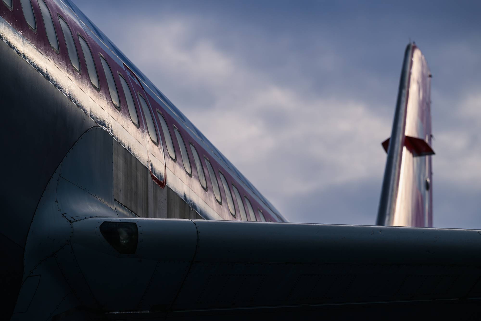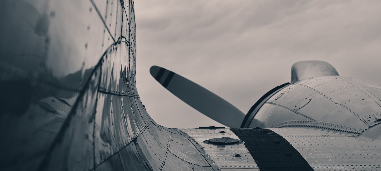 Hangar SentinelDimly lit side view of a vintage fighter jet’s nose and cockpit inside a hangar. Cockpit DomeFront-facing close-up of a fighter jet canopy with hangar lights reflecting on the curved glass. Winged GeometryA rear view of a commercial jet reveals clean metallic lines under a moody sky. Riveted GraceA close-up shows the curved body and rivets of a vintage propeller plane. Vintage PowerA vintage steam locomotive pushes forward through thick clouds of white steam. Iron ThrottleMetal valve wheel mounted on the side of a steam-locomotive boiler.