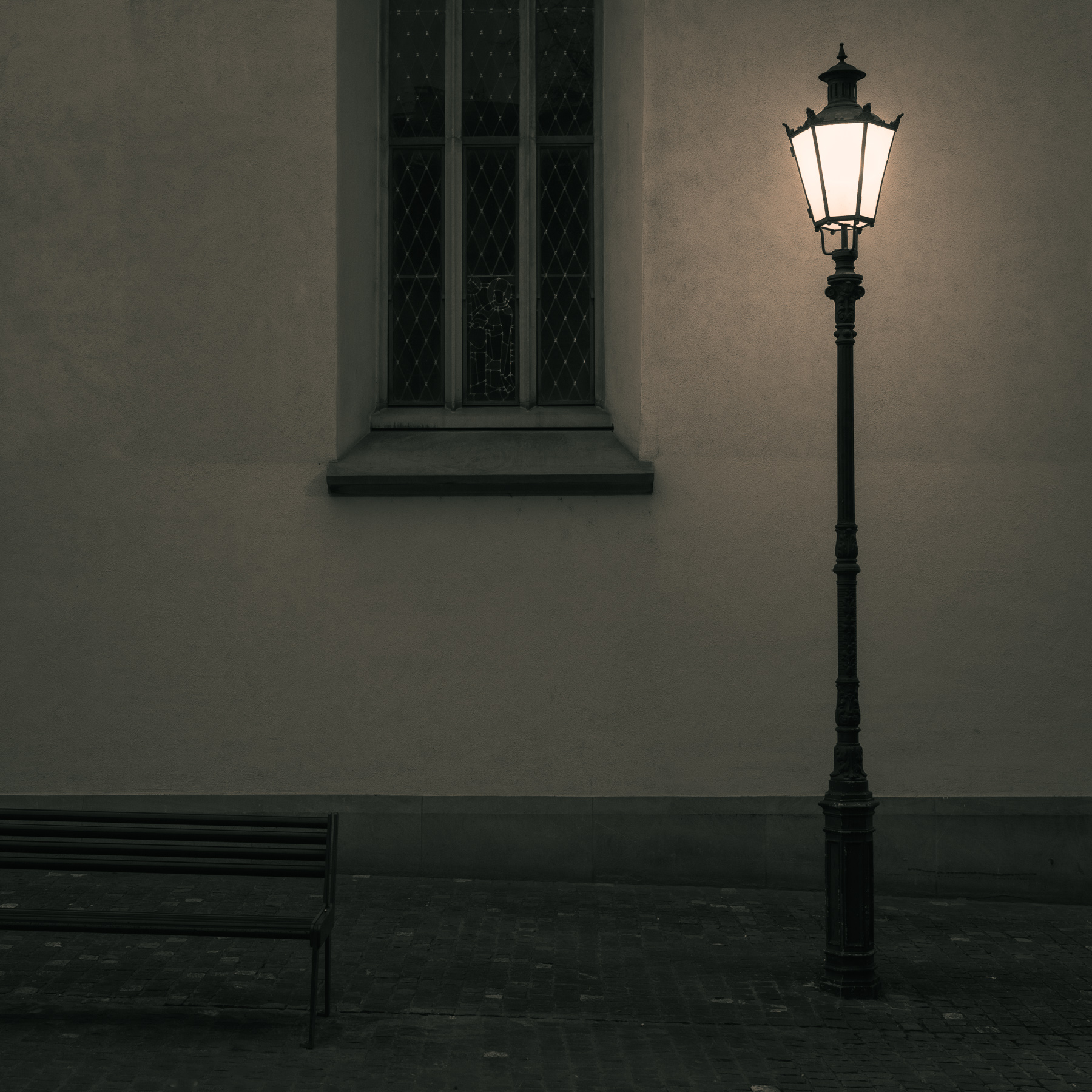A lone street lamp glows softly beside an old window and an empty bench, casting subdued light across a quiet, dimly toned city wall.