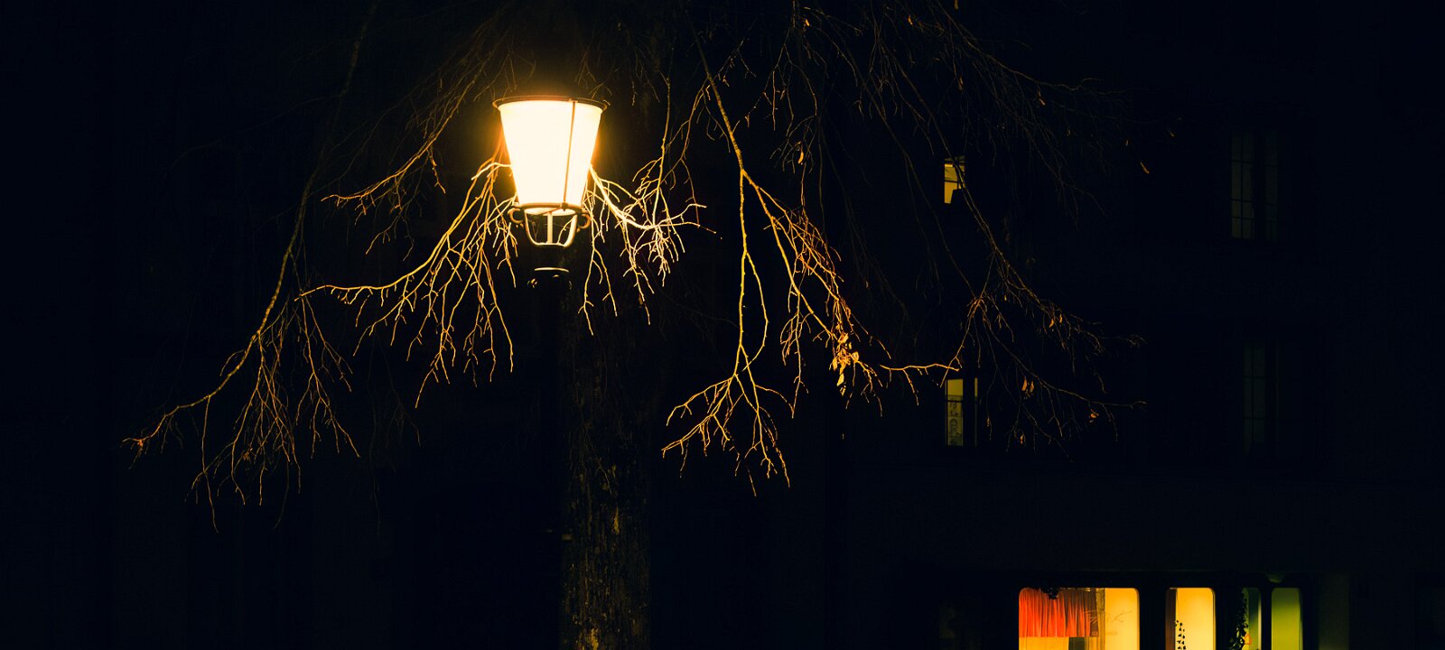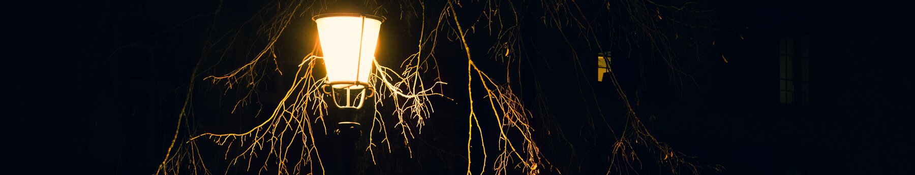 Night photograph of a glowing street lamp illuminating bare tree branches, with a bicycle silhouetted in front of a softly lit window in the background.