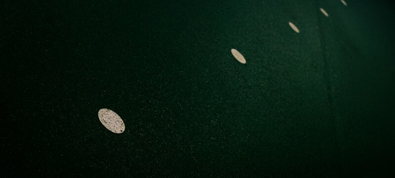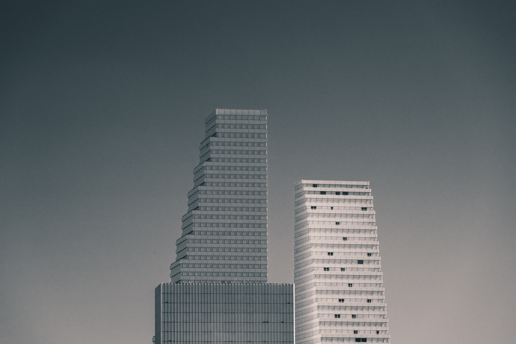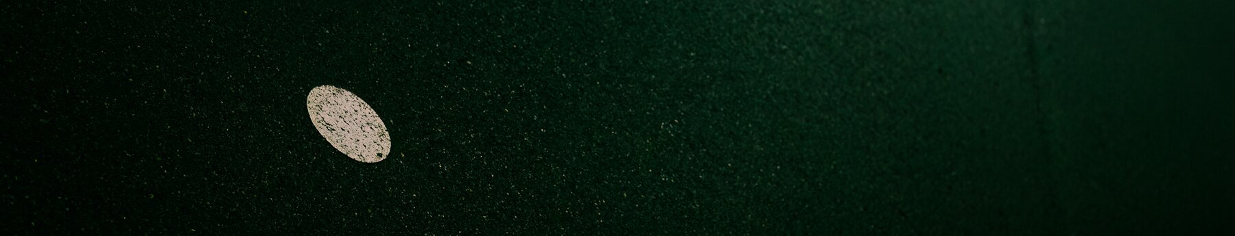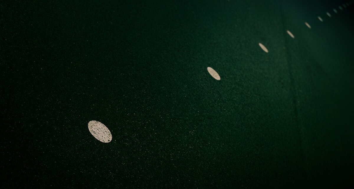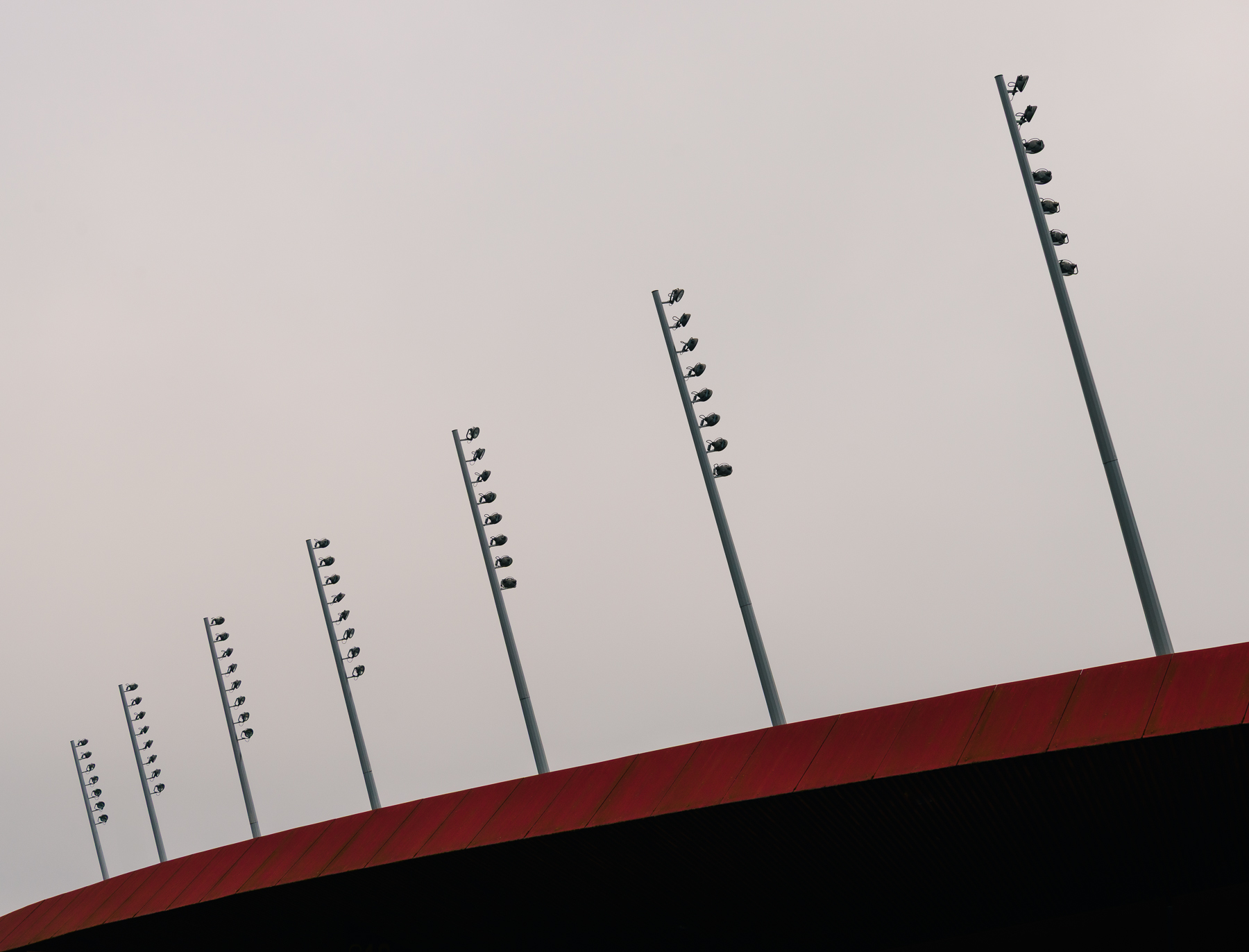 Minimalist architectural photograph featuring a line of stadium floodlights ascending above a red roof against a soft grey sky - a study in balance, rhythm, and calm geometry.