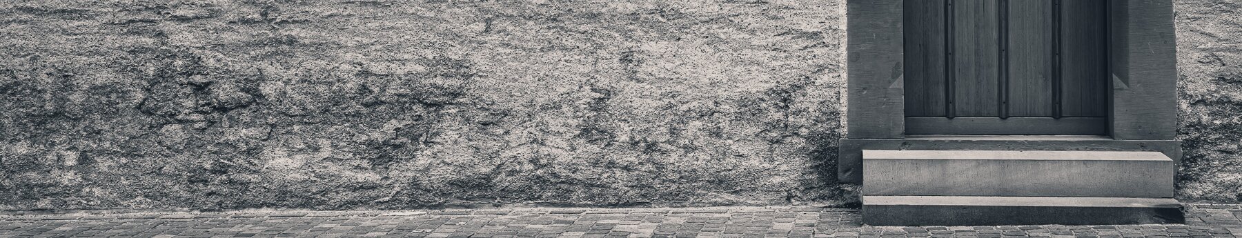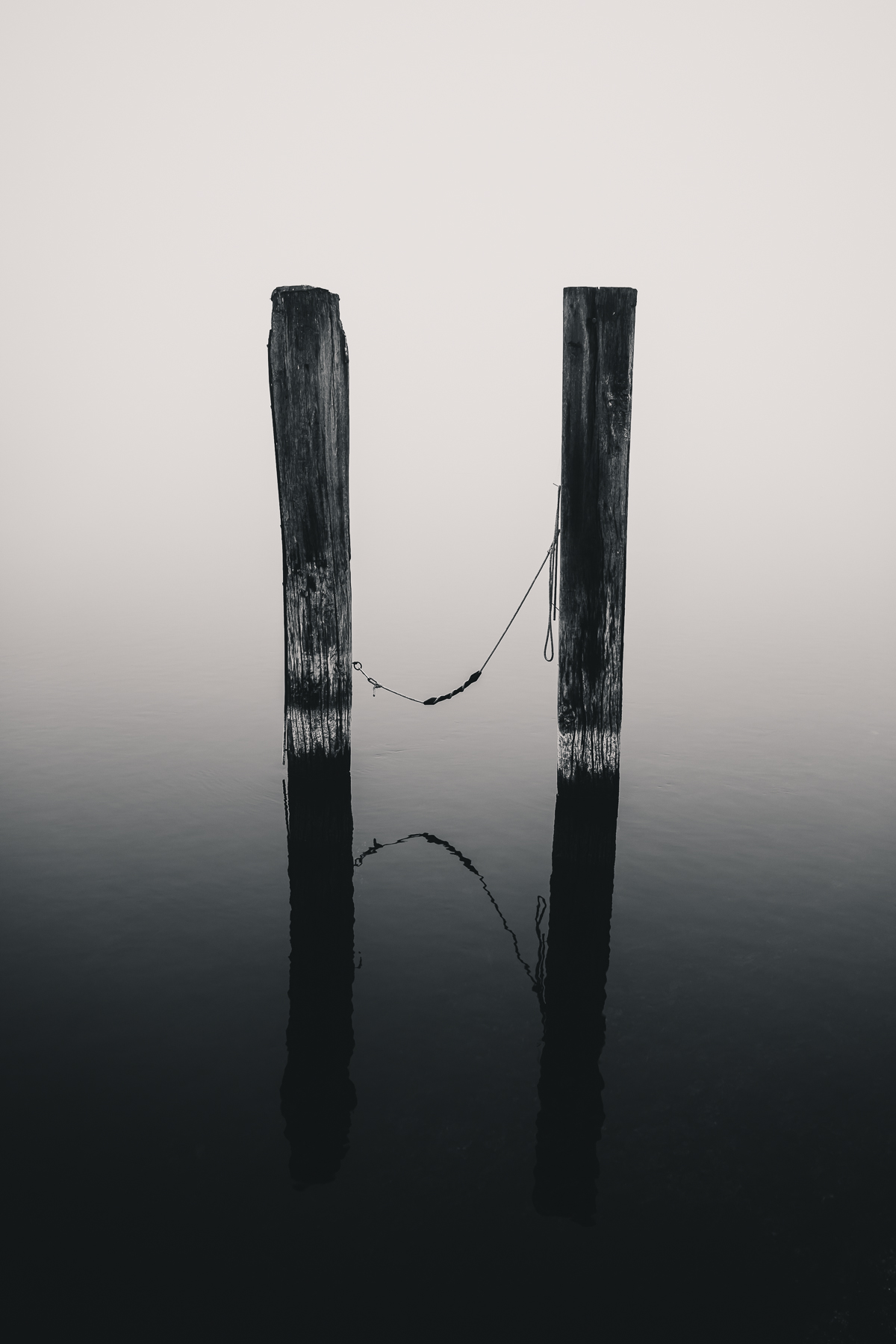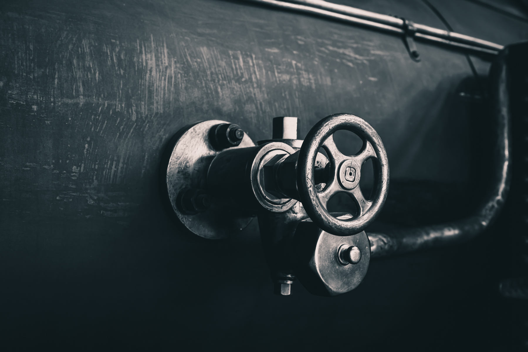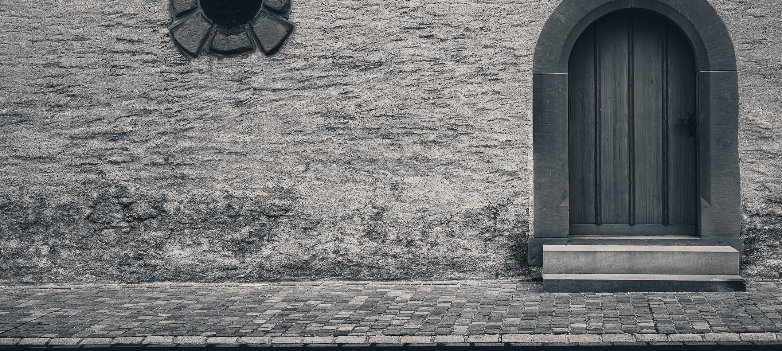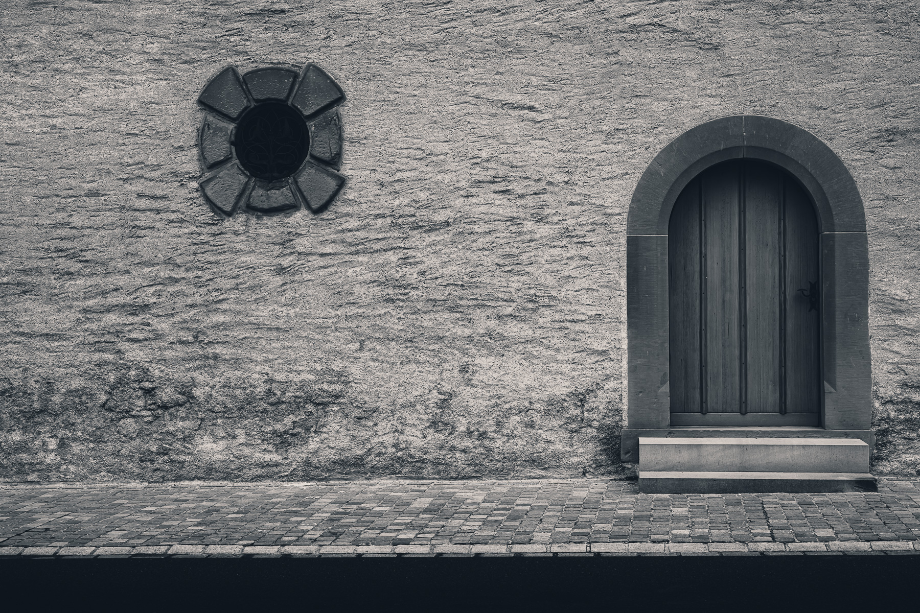 Arched EntryRough stone wall with arched wooden door and small circular window. Iron ThrottleMetal valve wheel mounted on the side of a steam-locomotive boiler. Tethered QuietTwo weathered wooden posts stand in calm water with a rope loosely connecting them, reflected in the still surface.