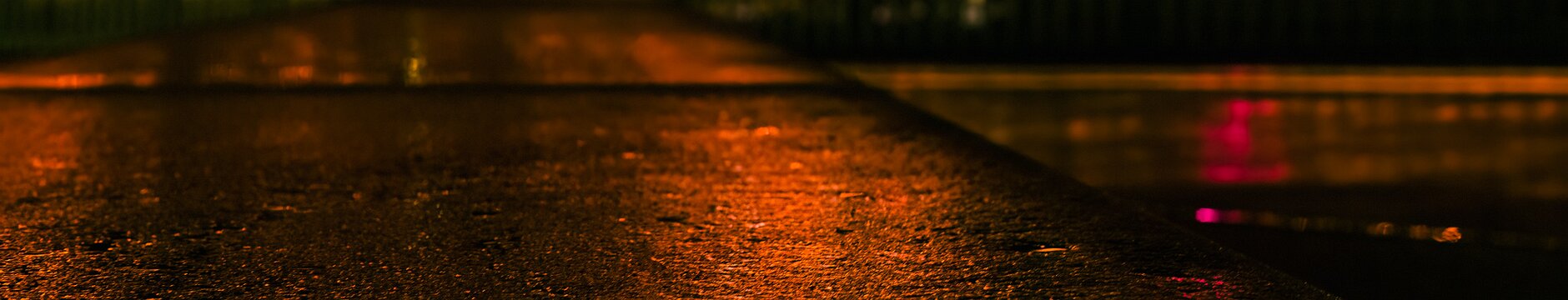 Glowline Low-angle night photograph showing warm orange holiday lights blurred into a horizontal ribbon above a wet pavement, with soft neon reflections in pink and...