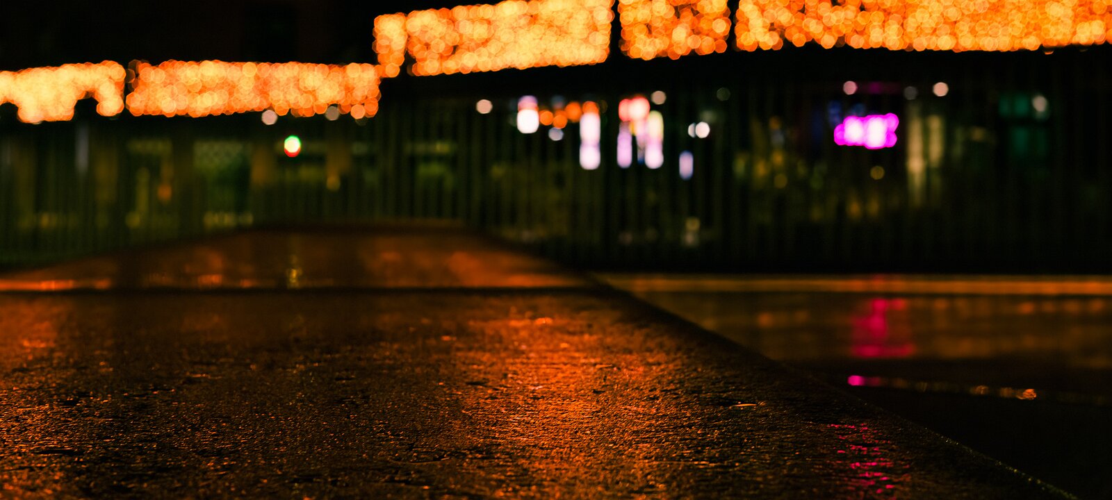 Low-angle night photograph showing warm orange holiday lights blurred into a horizontal ribbon above a wet pavement, with soft neon reflections in pink and green glowing on the surface.