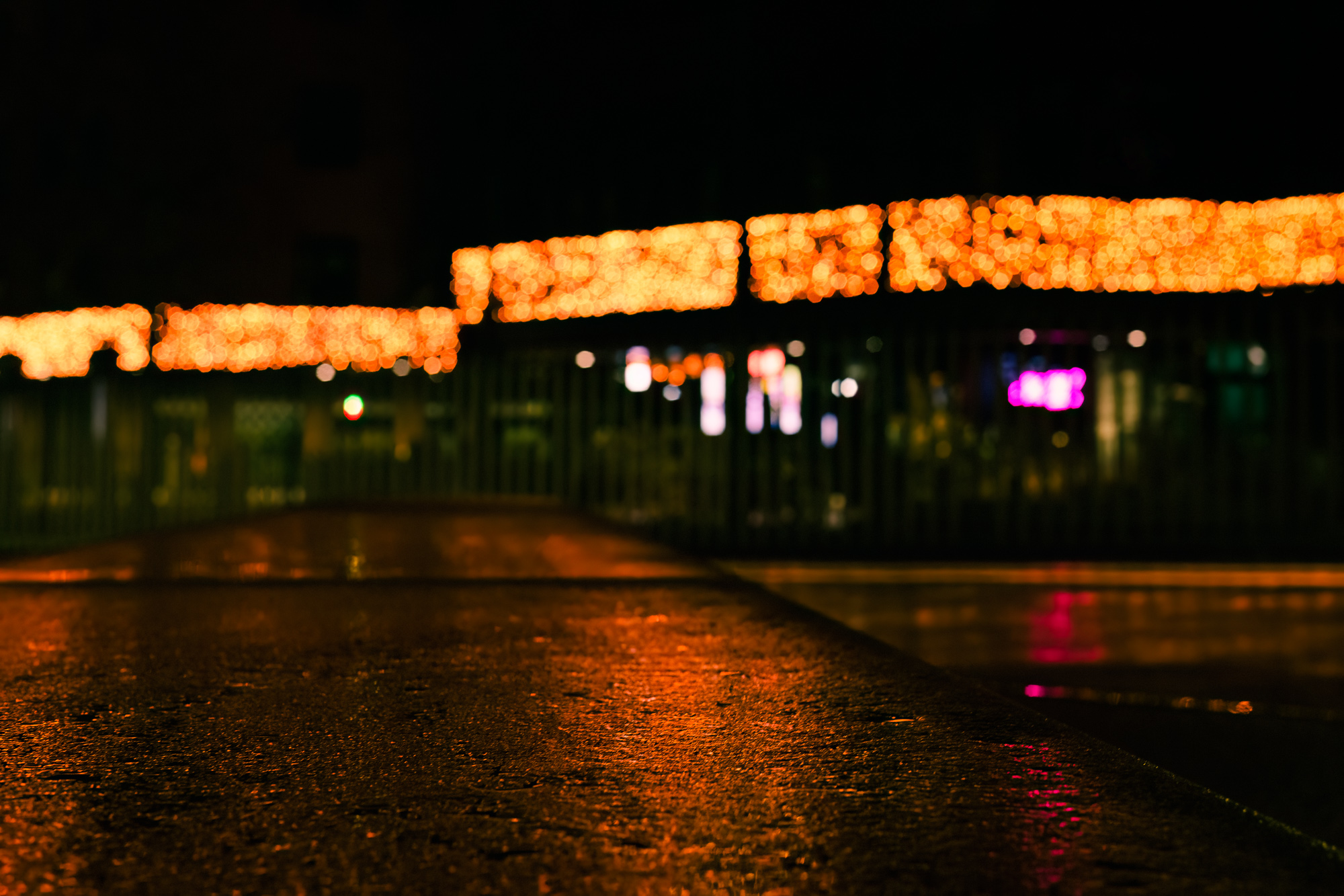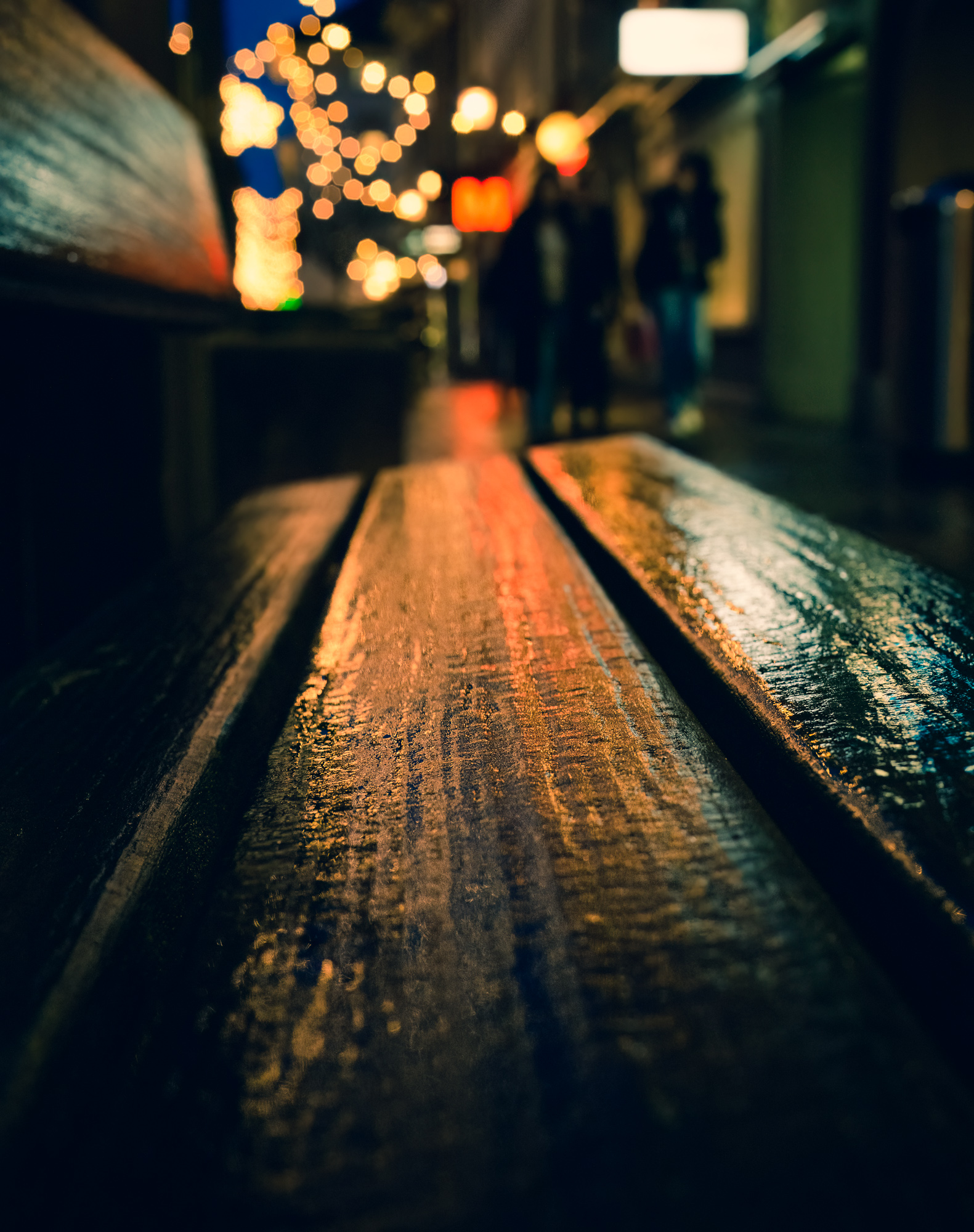 Rain-darkened wood catches the glow of distant streetlights, turning a simple bench into a quiet stage for the city’s passing life. Soft bokeh and silhouettes add warmth to the cold night air.