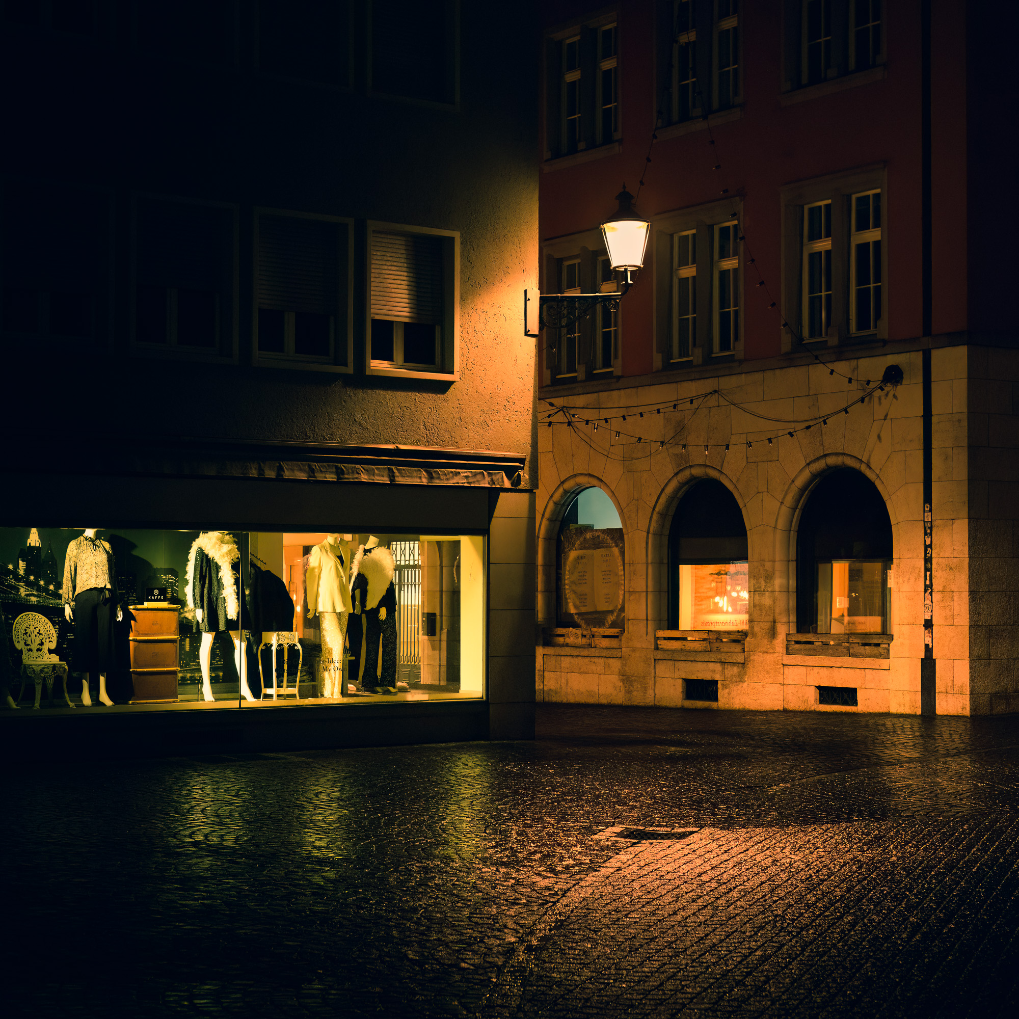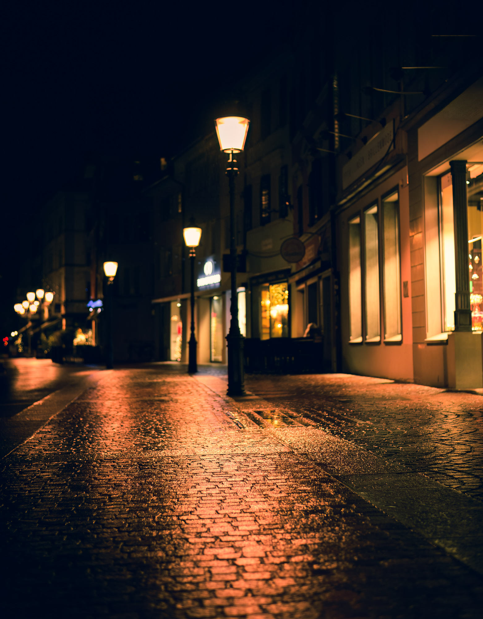 A quiet town square after dark, illuminated by a shop window and a solitary street lamp. Rain-soaked cobblestones reflect the warm glow, turning an empty scene into a cinematic fragment of urban stillness.