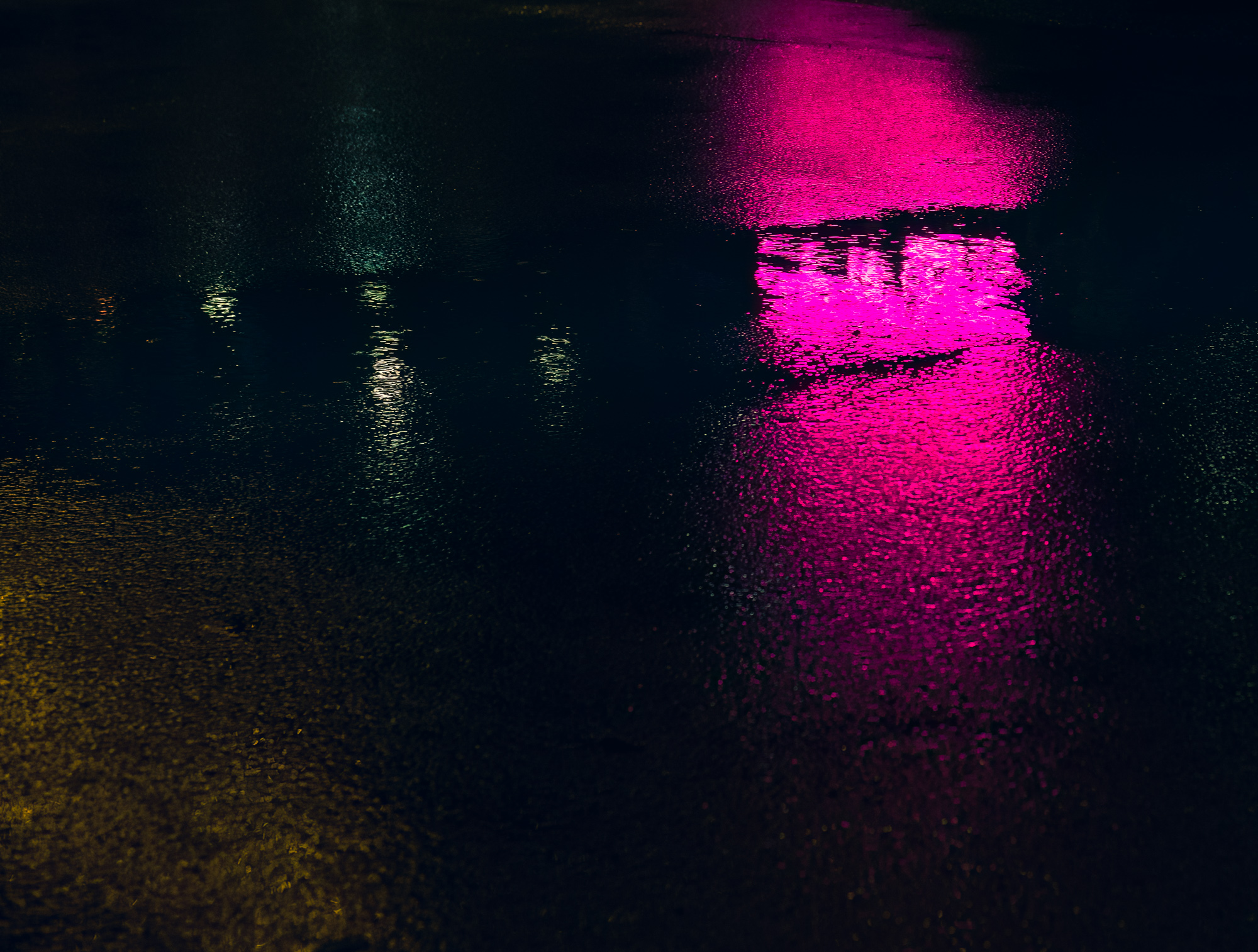 A vivid magenta reflection ripples across wet asphalt, turning a mundane puddle into an electric splash of color. The darkness surrounding it heightens the tension, letting the neon glow breathe like a heartbeat.