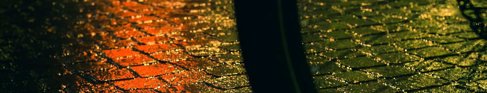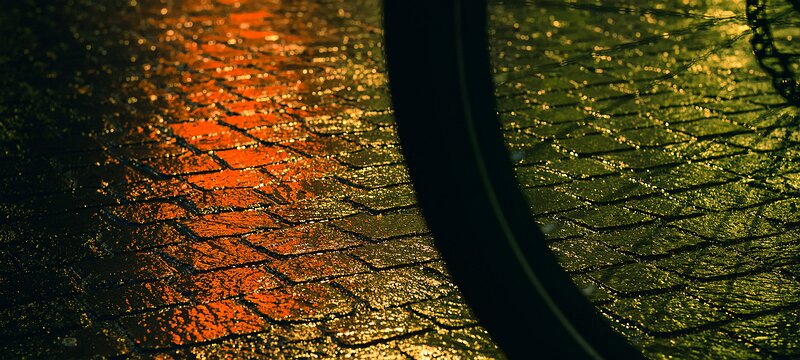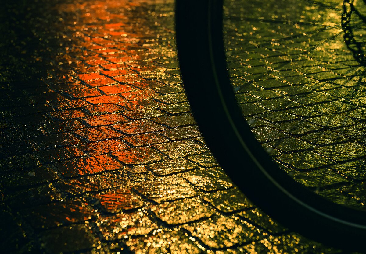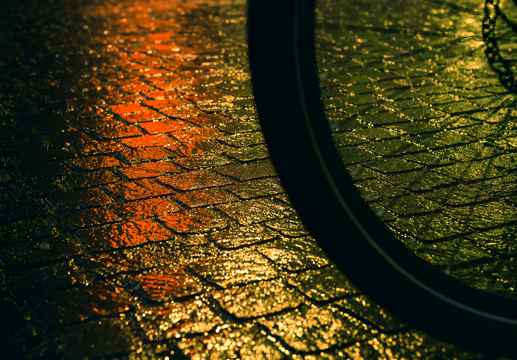 The shadow of a bicycle wheel cuts through glowing cobblestones, where warm reflections shimmer like molten color. A familiar street corner becomes a painterly fragment of motion and light.